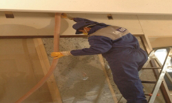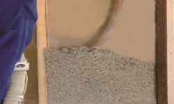 Füllen durch Blasen zwischen beidseitig geschlossenen Gipskartonwänden in Trockenwandsystemen.